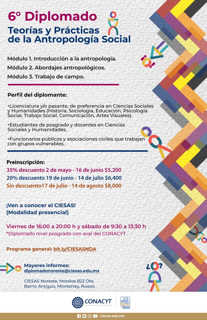 El 6to. Diplomado Teorías y práctica de la Antropología Social, se llevará a cabo del 18 de agosto de 2023 al 16 de diciembre de 2023