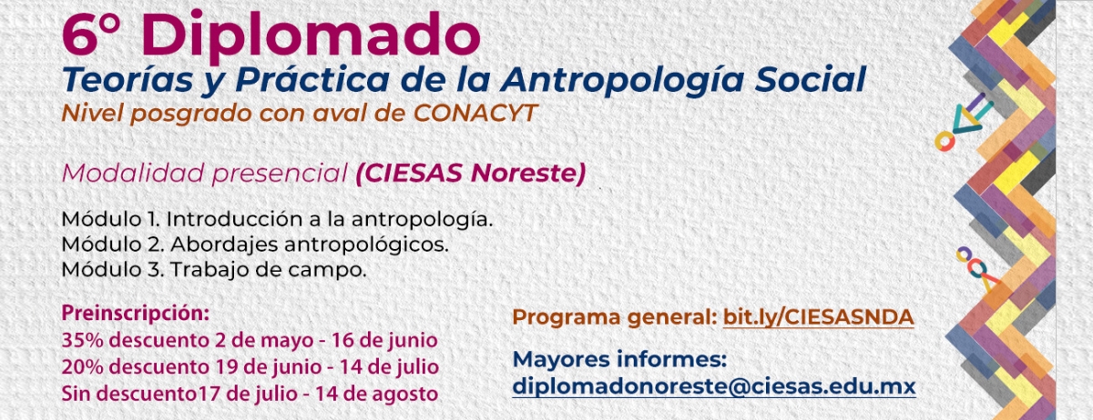 El 6to. Diplomado Teorías y práctica de la Antropología Social, se llevará a cabo del 18 de agosto de 2023 al 16 de diciembre de 2023